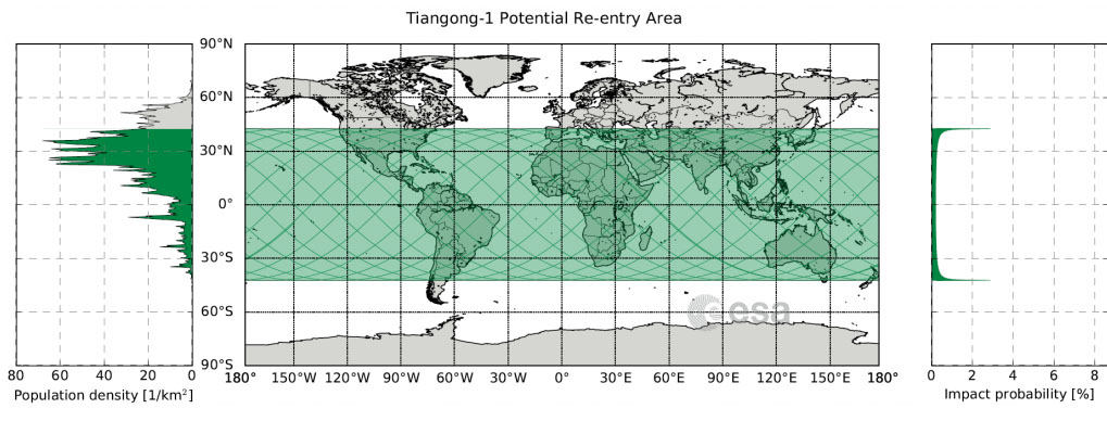 Less certain is where debris from the 8.5 metric ton space station, most of which will burn up in the Earth’s atmosphere, could land. Trackers say the station could re-enter Earth’s atmosphere somewhere within a wide swath of the planet; within the latitudes 43ºN and 43ºS, according to ESA.