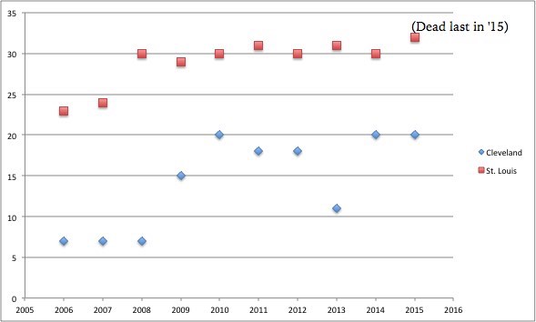 Rams owner Stan Kroenke’s report to the NFL, which put the city’s image in the national eye, drew cries from the populace. Yet, there are some elements of truth there: St. Louis is not doing particularly well. Elected officials, as is expected, defended the city. The long-time mayor, Francis Slay, penned a “hey, it’s not as bad as he says” letter to the NFL comparing St. Louis to a handful of like cities, including… Cleveland.
