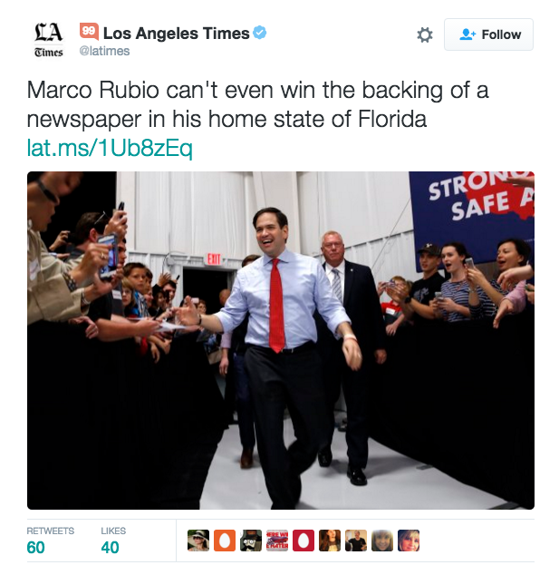 “Marco Rubio can’t even win the backing of a newspaper in his home state of Florida,” the paper declared in its headline.
