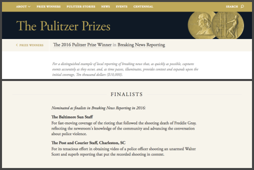 “For fast-moving coverage of the rioting that followed the shooting death of Freddie Gray, reflecting the newsroom’s knowledge of the community and advancing the conversation about police violence,” the committee’s website said Monday.