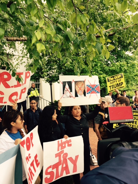 Trump entered the RNC’s headquarters through a back door as protesters stood outside the Capitol Hill building. Many of the demonstrators were affiliated with immigration groups like United We Dream Action and sought to voice concern over Trump’s policies and rhetoric on immigration, chanting “undocumented and unafraid,” and “stop the hate” as Trump and others arrived.