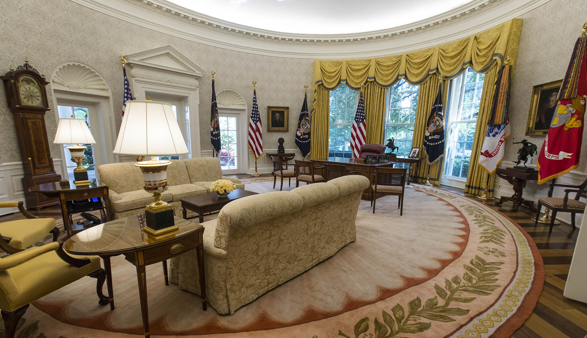 The only significant alteration to the Oval Office, tour guides said, was a change of wallpaper, updated with a classic design selected by President Trump.