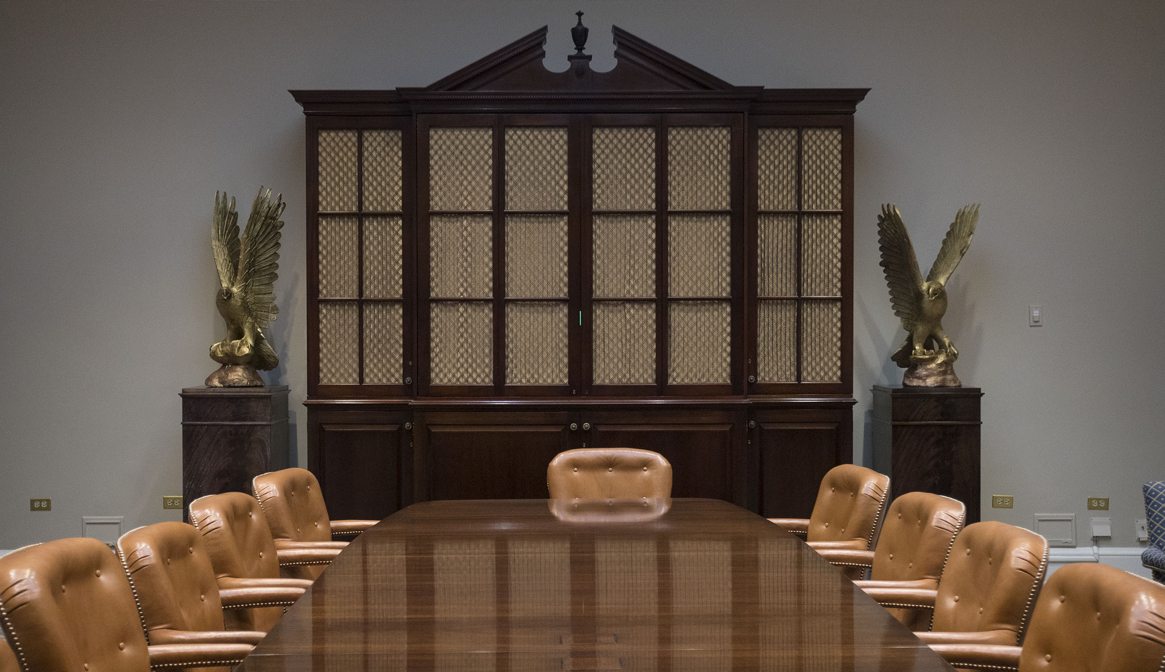 The large carved eagles are certain to be photographed often inside the boardroom where they will face President Trump and a painting of Theodore Roosevelt during meetings. The pair was purchased recently by George Kanellos, historic preservation officer at the White House.