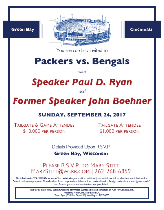 Supporters who contribute $1,000 to Ryan’s 2018 re-election campaign for Wisconsin’s 1st Congressional District will get to tailgate alongside the GOP leaders at the Sept. 24 game between the Green Bay Packers and Cincinnati Bengals.