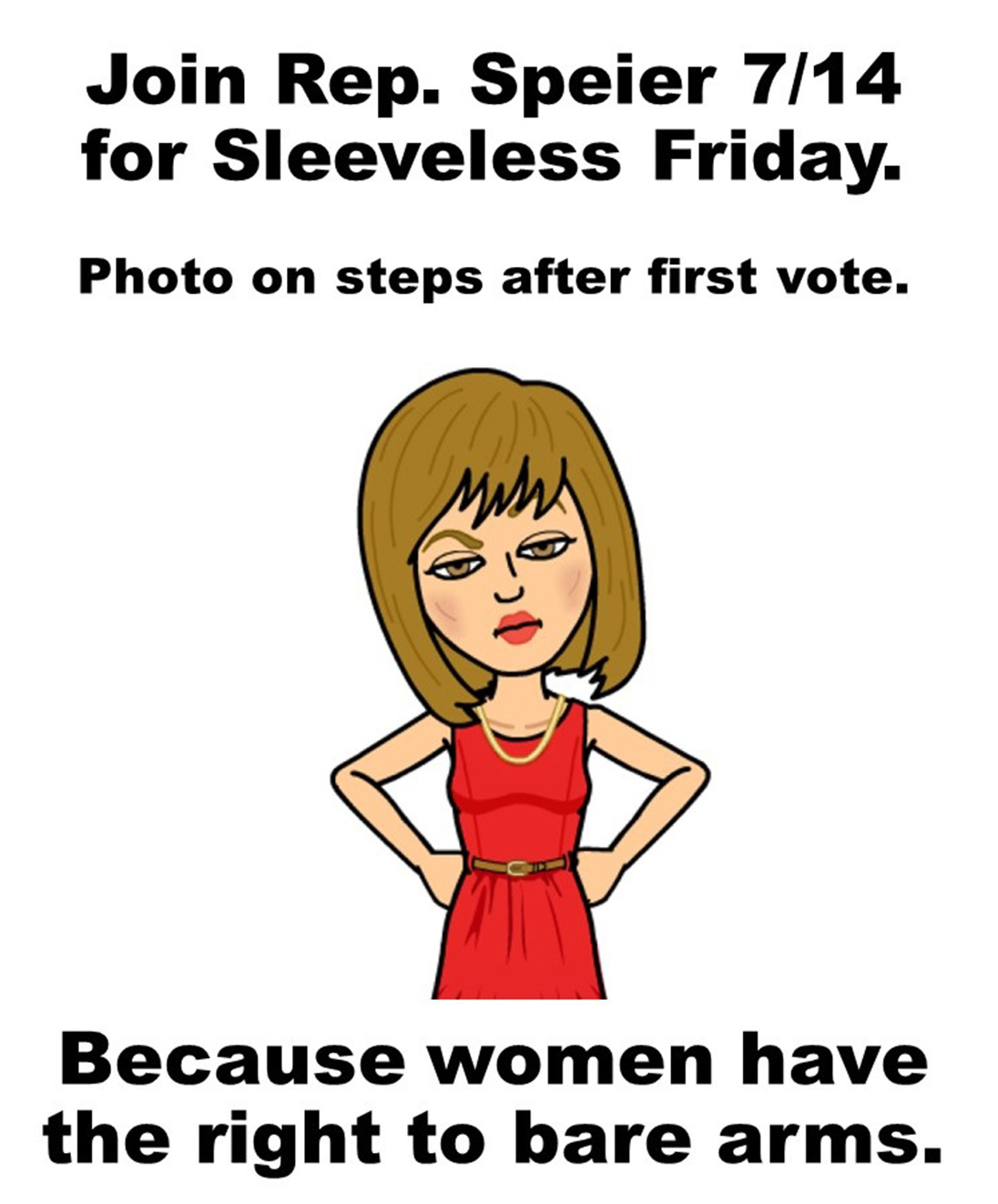 Rep. Jackie Speier, D-Calif., is asking her female colleagues to take part in a sleeveless photo-op Friday on the East Capitol steps shortly after the House meets for its first votes.