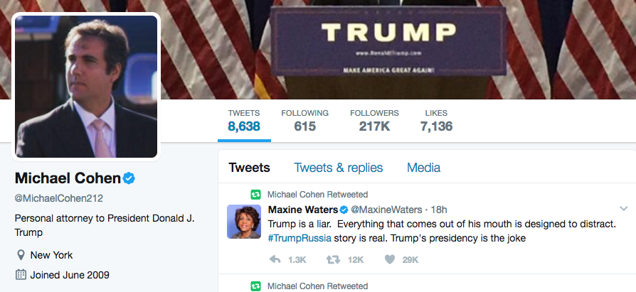 President Trump’s personal attorney Michael Cohen retweeted one of Trump’s biggest critics on Tuesday, in which Democratic Rep. Maxine Waters called the president “a liar.”