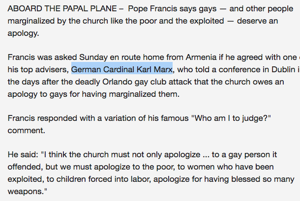 “Francis was asked Sunday en route home from Armenia if he agreed with one of his top advisers, German Cardinal Karl Marx, who told a conference in Dublin in the days after the deadly Orlando gay club attack that the church owes an apology to gays for having marginalized them,” the AP’s original story reported.
