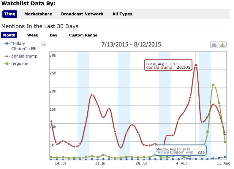 Cable and network television have been mostly disinterested in the FBI story, opting instead to focus more on former reality TV star Donald Trump and the recent unrest in Ferguson, Mo., according to data compiled by TV Eyes:
