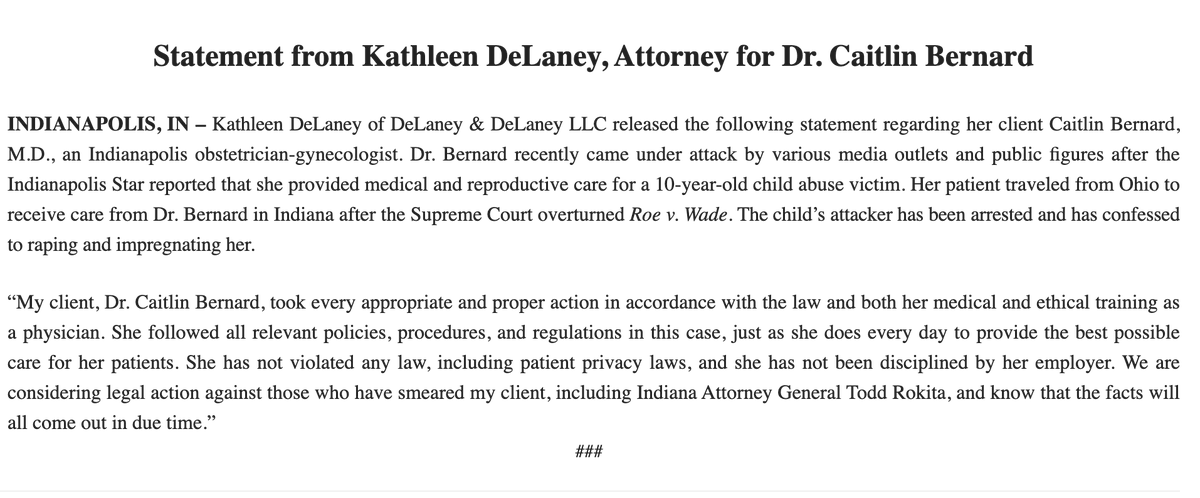 “My client, Dr. Caitlin Bernard, took every appropriate and proper action in accordance with the law and both her medical and ethical training as a physician,” Kathleen Delaney, who represents Bernard, said in a statement Thursday. “She followed all relevant policies, procedures, and regulations in this case, just as she does every day to provide the best possible care for her patients. She has not violated any law, including patient privacy laws, and she has not been disciplined by her employer. We are considering legal action against those who have smeared my client, including Indiana Attorney General Todd Rokita, and know that the facts will all come out in due time.”