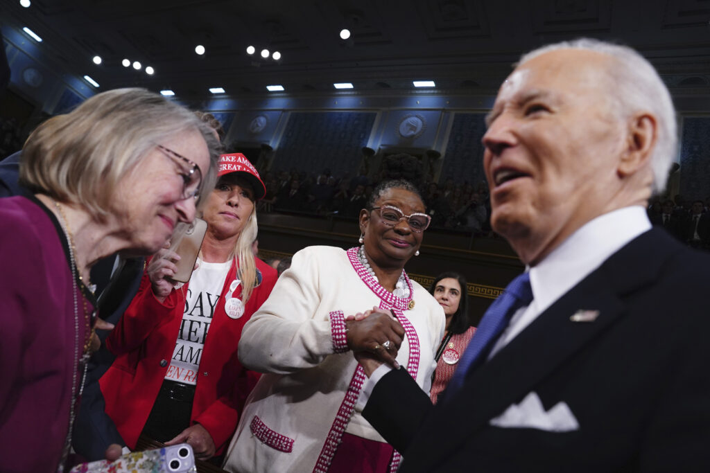 President Joe Biden, right, arrives to deliver the State of the Union address to a joint session of Congress at the Capitol, Thursday, March 7, 2024, in Washington. Looking on at second left is Rep. Marjorie Taylor Greene (R-GA). (Shawn Thew/Pool via AP)