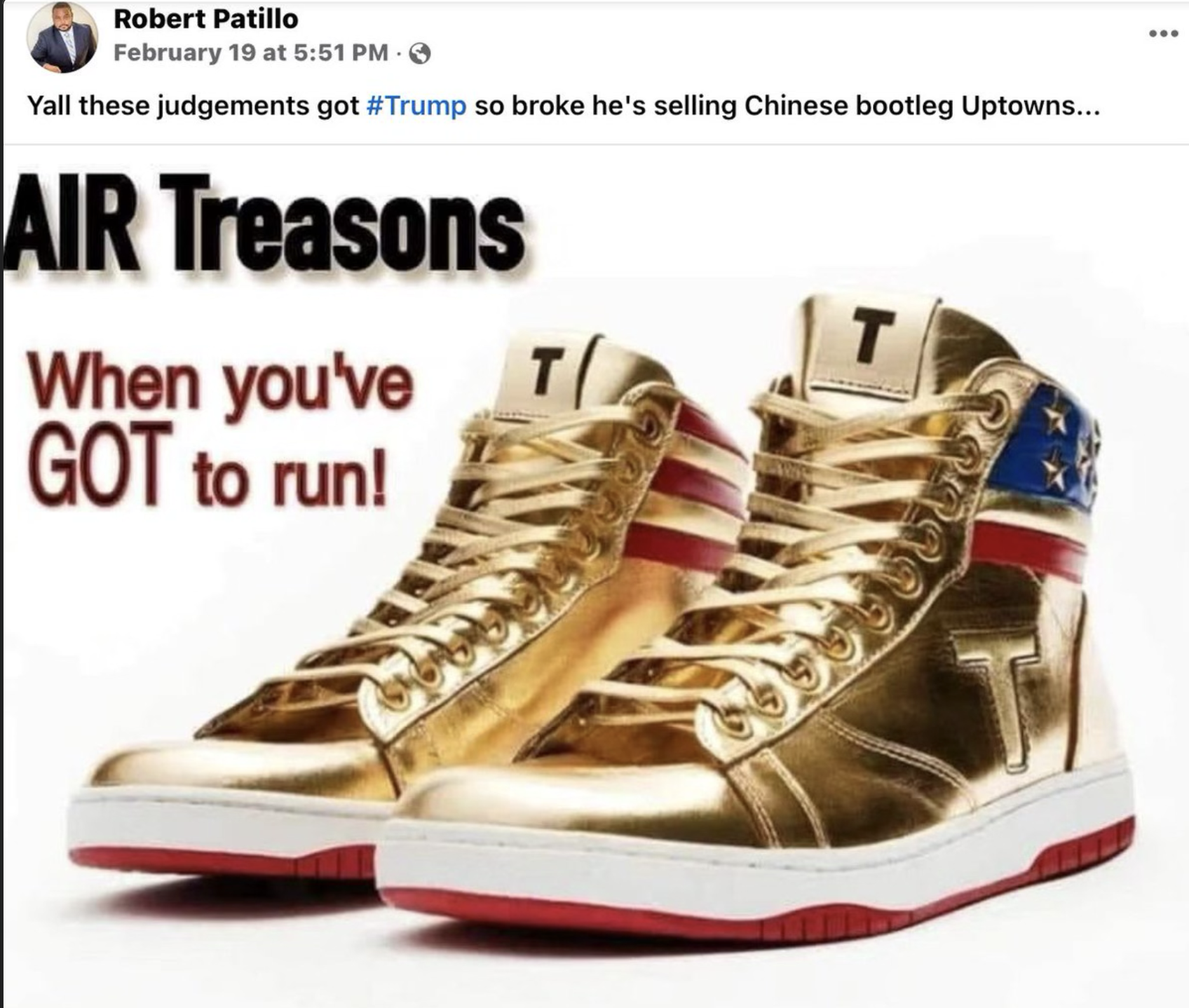 On Feb. 19, Patillo made another Facebook post above an edited photo of Trump’s limited-edition golden sneakers dubbed the “Never Surrender” high-tops, with a caption reading: “AIR Treasons When you’ve GOT to run!”