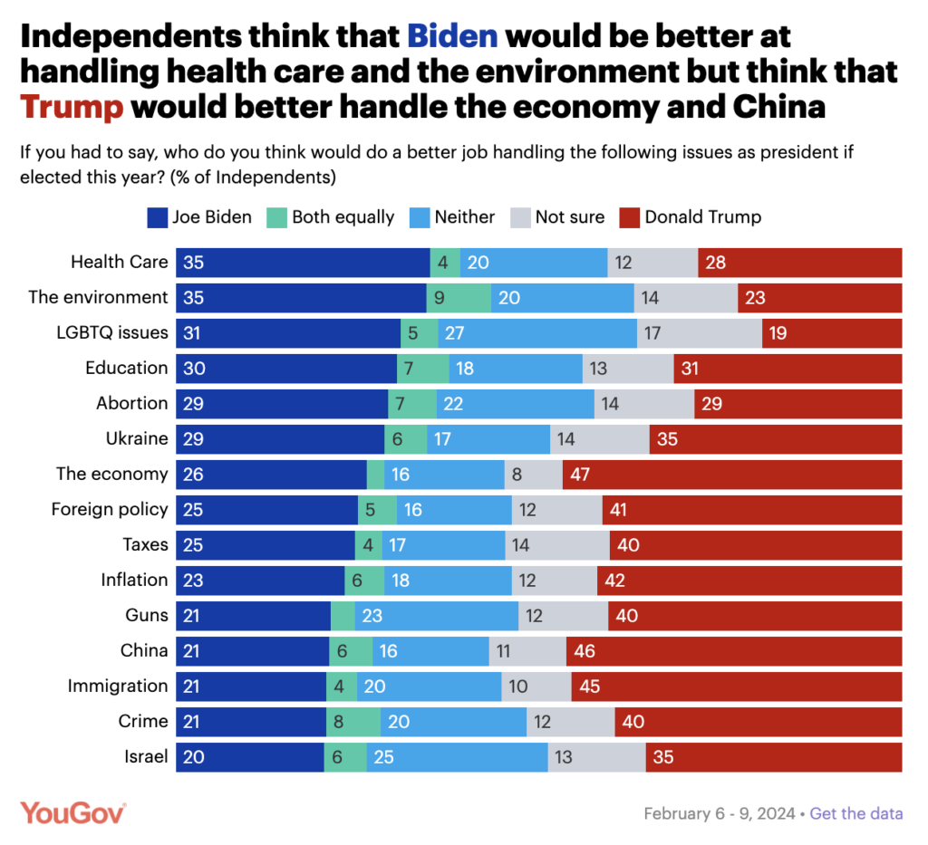 “Independents say Biden would be better than Trump at handling healthcare (35% vs. 29%), the environment (35% vs. 23%), and LGBTQ issues (31% vs. 19%). They think Trump would handle nearly all of the remaining issues better than Biden would, including the economy (47% vs. 26%), China (46% vs. 21%), immigration (45% vs. 21%), inflation (42% vs. 23%), and foreign policy (41% vs. 25%),” the analysis said.