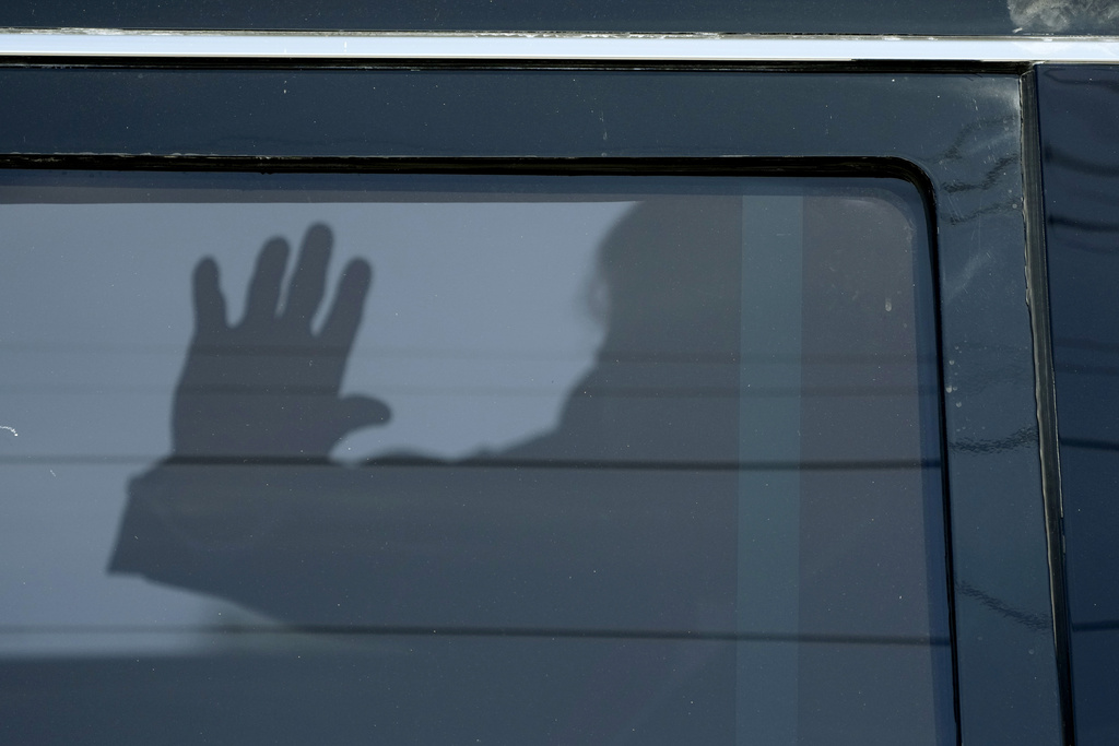 Former President Donald Trump waves to supporters as he leaves federal court, Thursday, March 14, 2024, in Fort Pierce, Florida. (AP Photo/Wilfredo Lee)
