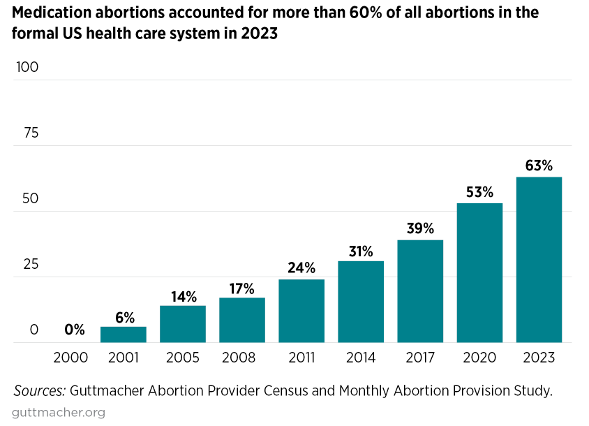 New data from the abortion-rights think tank the Guttmacher Institute show that over 63% of abortions in 2023 were conducted by abortion pill, up 10 percentage points from 2020.