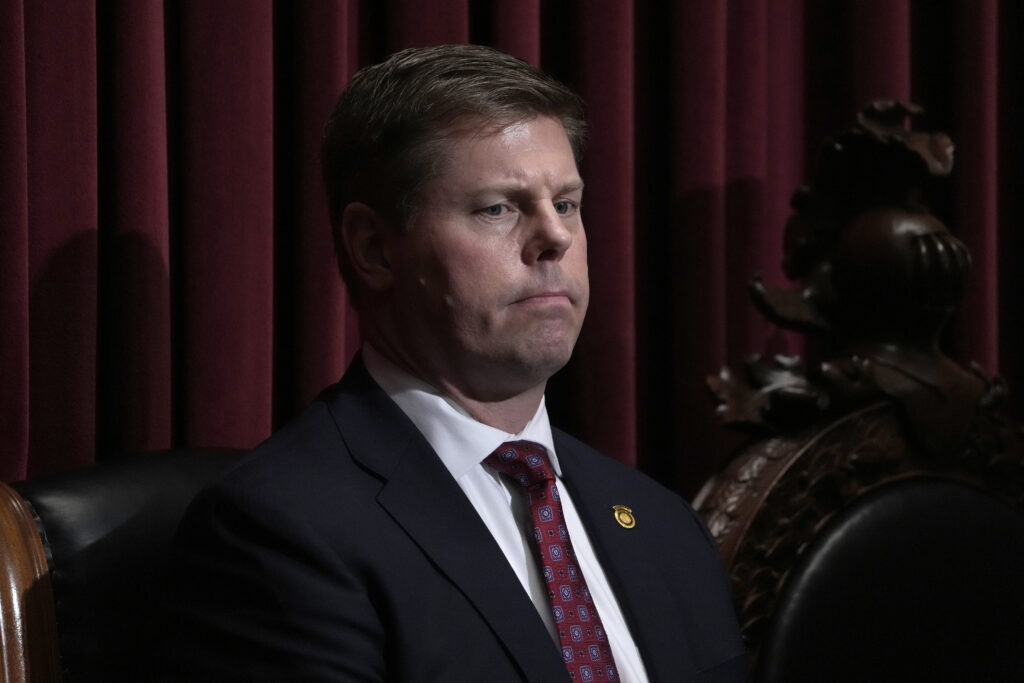 Missouri Speaker of the House Dean Plocher listens as Gov. Mike Parson delivers the State of the State address, Jan. 24, 2024, in Jefferson City, Missouri. A Missouri ethics panel is at an impasse over reported misconduct by the powerful state House speaker, who allegedly used his office to stymie an investigation into his actions. (AP Photo/Jeff Roberson, File)