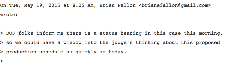 Brian Fallon, Clinton’s campaign spokesman and a Justice Department alum, wrote in May 2015 that “DOJ folks” had tipped him off to an upcoming status hearing in a high-profile lawsuit that threatened to expose Clinton’s 30,000 work-related emails to the public.