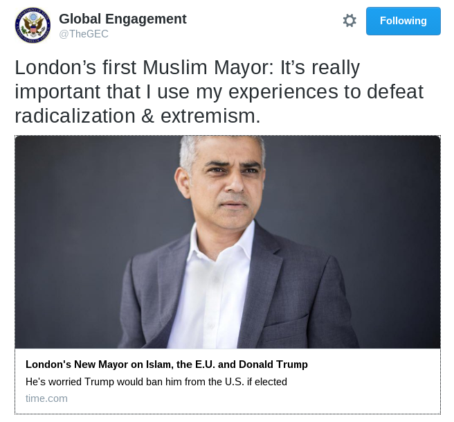 Global Engagement (formerly known as Think Again, Turn Away) is the State Department’s anti-terrorism communications division specializing in social media messaging to dissuade would-be terrorists from joining ISIS or similar groups. Tuesday, the Global Engagement Twitter account tweeted a link to a Time Magazine article accompanied by the text “London’s first Muslim Mayor: It’s really important that I use my experiences to defeat radicalization & extremism.”