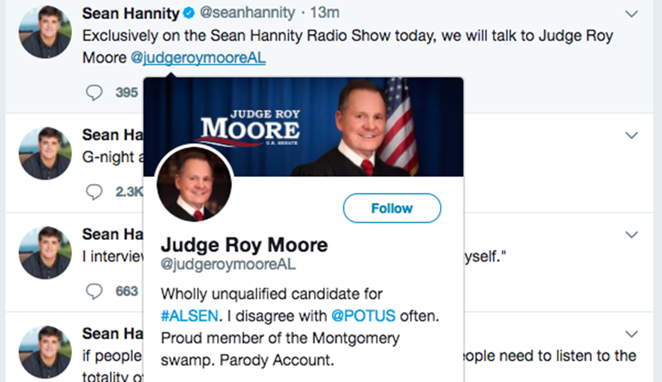 Hannity, who has been open to Moore’s site of the story, tagged @judgeroymooreAL, a fake Twitter handle that says Moore is “wholly unqualified” to be in the Senate.