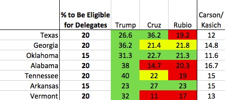 In Texas, Georgia, Tennessee, Alabama, Oklahoma, Arkansas and Vermont, Cruz and Rubio could find themselves on the wrong side of a voting threshold. The table below lists the minimum percent cutoff in each of these states next to the poll numbers for Trump, Cruz and Rubio in each. The combined support of Carson and Kasich is shown in the last column.