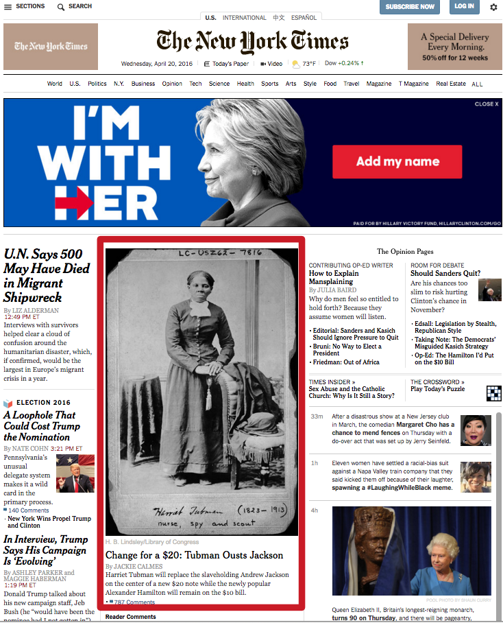 Calmes’ article was featured front and center on the Times homepage, bearing the headline, “Change for a $20: Tubman Ousts Jackson.”
