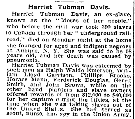“Harriet Tubman Davis, an ex-slave, known as the ‘Moses of her people,’ who before the civil war took 300 slaves to Canada through her ‘underground railroad,’ died on Monday night at the home she founded for aged and indigent negroes at Auburn, N.Y.,” the 131-word article began. “She was said to be 98 years old, and her death was caused by pneumonia.”