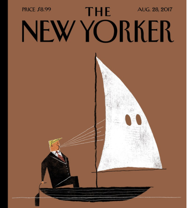 Next week’s cover of the New Yorker features President Trump sailing on a boat with a sail shaped like a Ku Klux Klan hood.