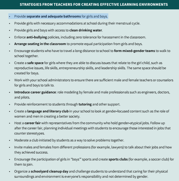 In a nod to reality, however, the document contains some interesting ideas that appear to clash with recent cultural and societal trends, including the Obama administration’s new directive regarding bathrooms and transgendered people in public schools. Under the heading of “strategies from teachers for creating effective learning environments,” the very first item on the list is “Provide separate and adequate bathrooms for girls and boys.”