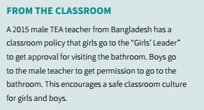 Another idea in the document addresses safety concerns by having girls and boys obtaining permission to use the bathroom from a teacher or “leader” of their own gender.