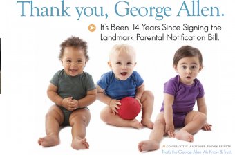 Allen, who was known as a conservative leader during his years as Governor and U.S. Senator, was instrumental in the passage of the bipartisan parental notification bill through the Virginia General Assembly that required physicians to notify at least one parent or guardian before performing an abortion. While in the U.S. Senate, Allen co-sponsored a partial-birth abortion bill and opposed federal monies for overseas organizations that funded abortions.