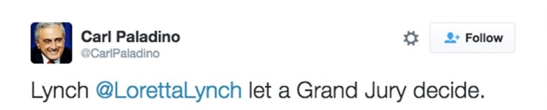 New York businessman Carl Paladino’s Twitter account said Wednesday morning, “Lynch @LorettaLynch let the Grand Jury decide.”