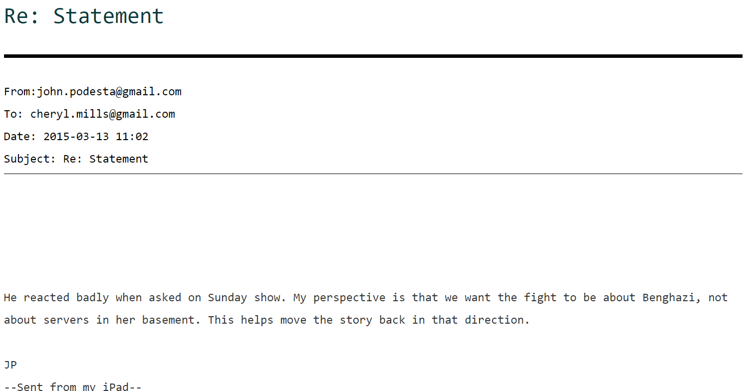 Shortly after the New York Times exposed Clinton’s use of a private server to conduct government business at the State Department, Podesta told Cheryl Mills, a longtime Clinton confidante, that he wanted the political “fight to be about Benghazi, not about servers in her basement.”