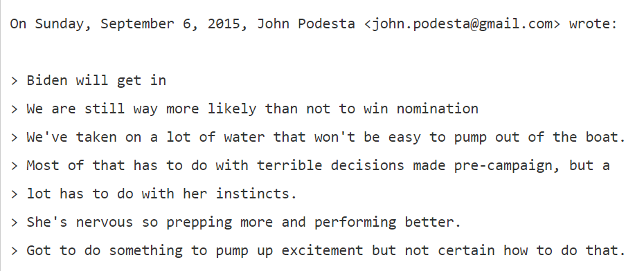 Podesta expressed confidence in Sept. 2015 that Vice President Joe Biden would enter the presidential race. At the time, Clinton’s primary campaign was stumbling over the newly-opened FBI investigation into her emails, scrutiny over an upcoming Benghazi hearing and the rising popularity of Sanders.