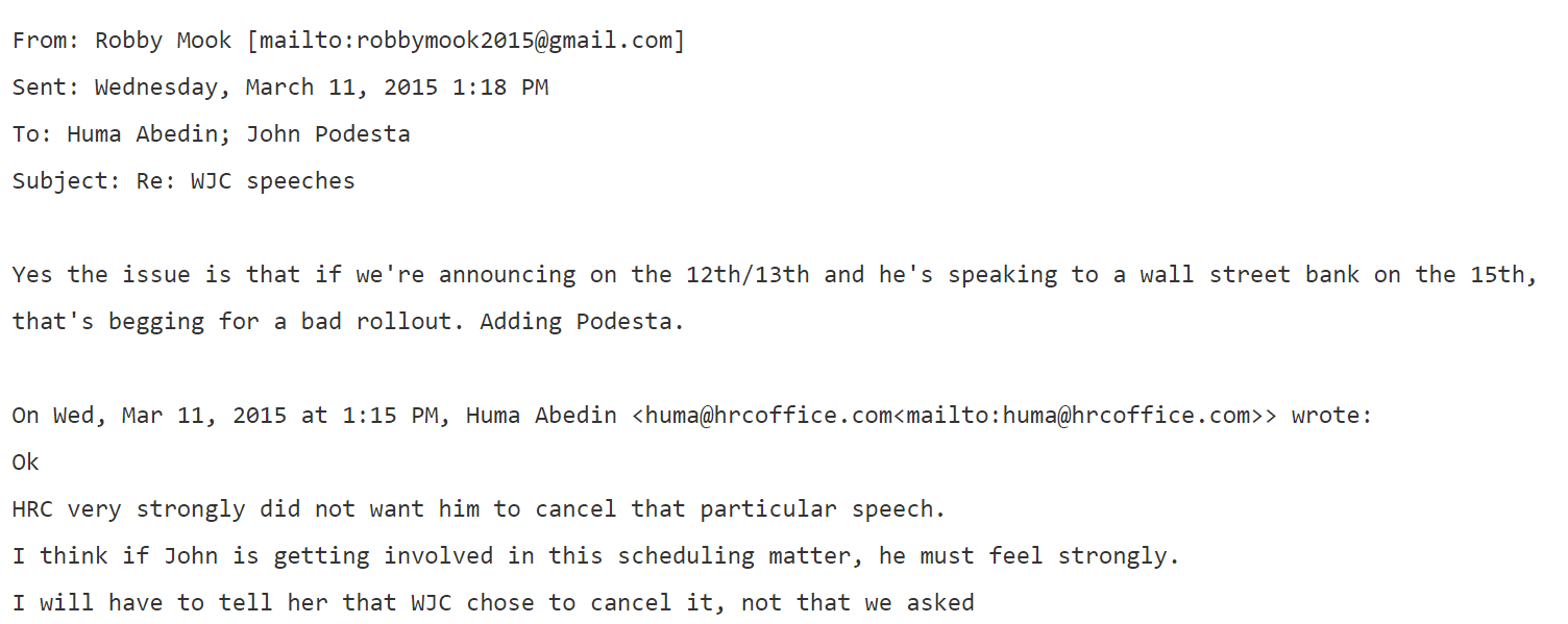 Clinton strongly objected to campaign manager Robby Mook’s push for her husband to cancel a planned paid speech to Morgan Stanley just a few days after the official launch of her campaign. Mook feared the negative optics of the speech could “plague us in stories for months.”