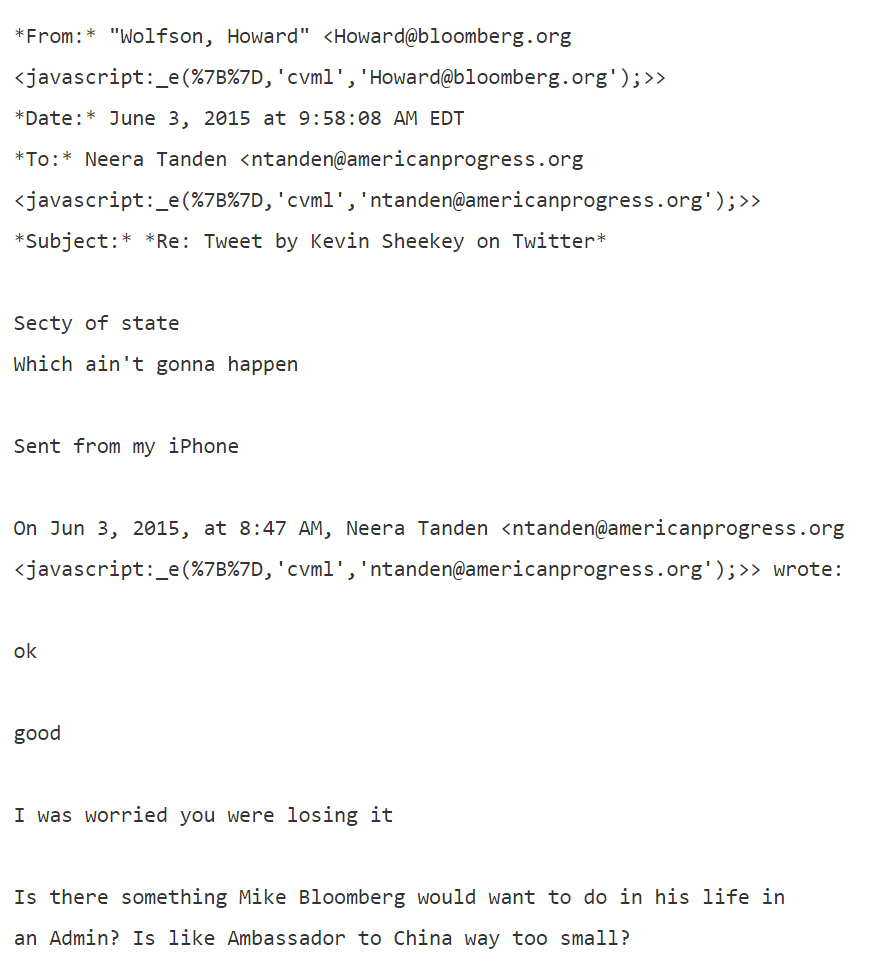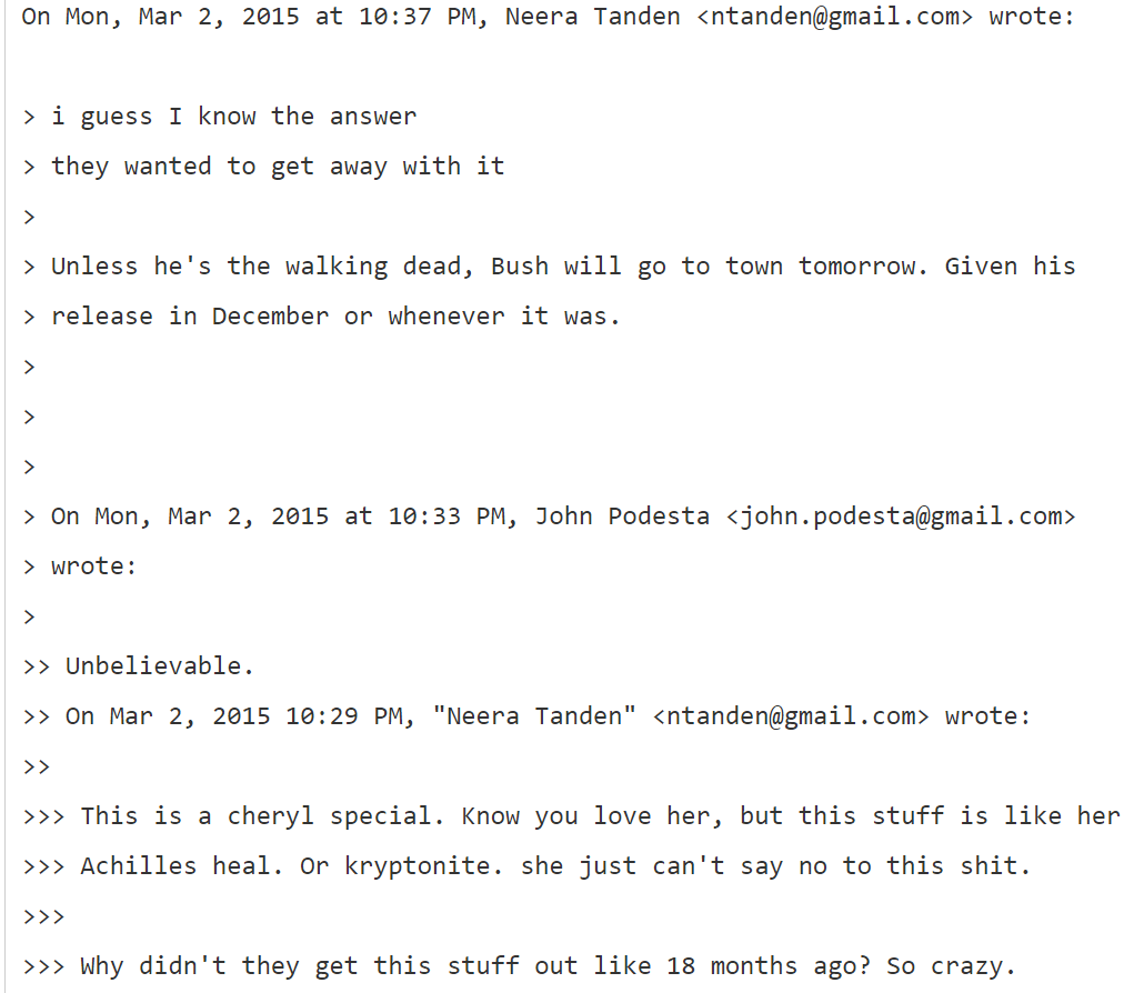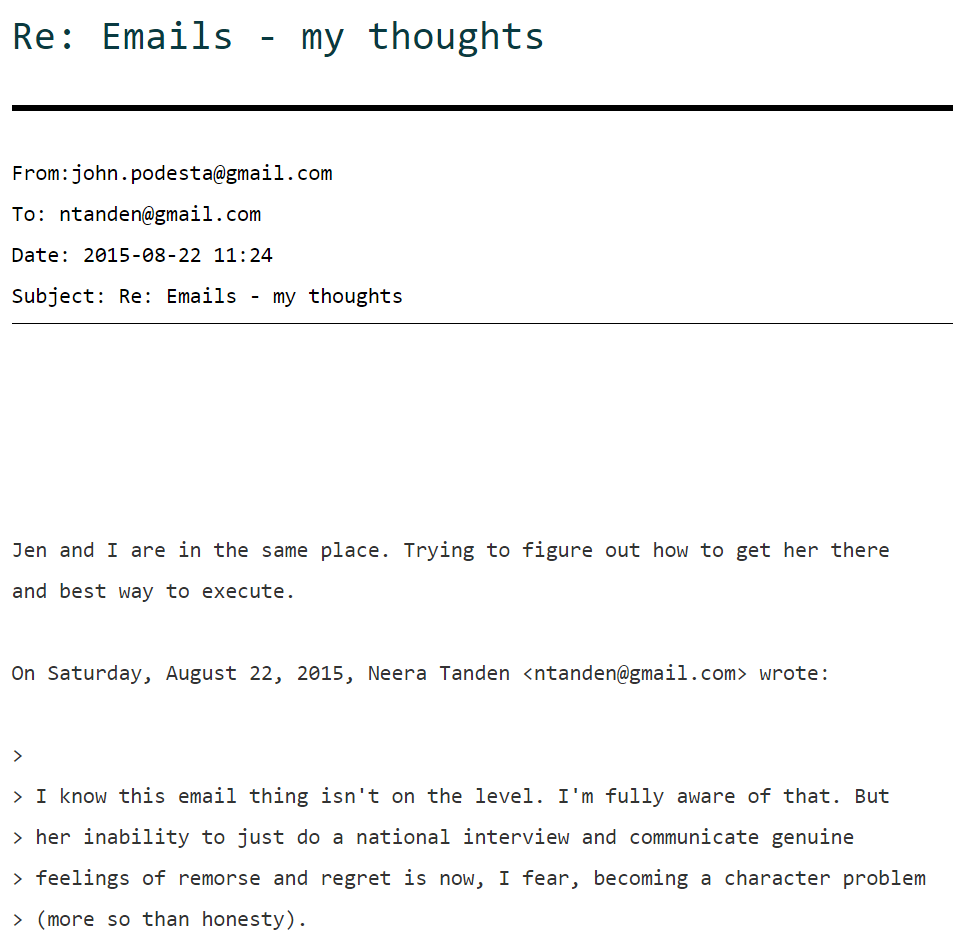 Tanden confided in Podesta in Aug. 2015 that Clinton’s inability to express remorse for her use of a private email server was likely fueling controversy.