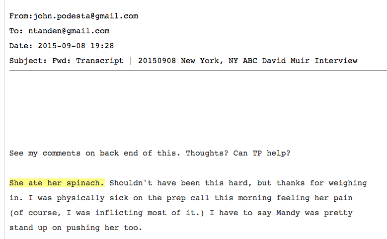 Podesta compared Clinton’s attempt to apologize for her private email use to eating spinach given her resistance to the idea of expressing remorse.
