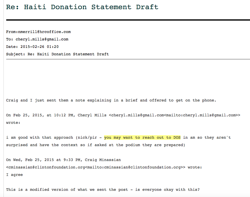 Cheryl Mills, presently a board member at the Clinton Foundation, suggested coordinating with the State Department in Feb. 2015 on how to handle inquiries about a previously undisclosed foreign donation the foundation had received to perform Haiti relief efforts.