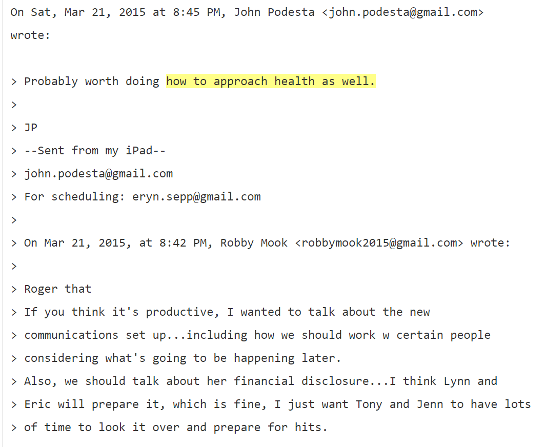 In a conversation with campaign manager Robby Mook, Podesta expressed his desire to have Clinton’s “self-research” team prepare “how to approach health” in anticipation of attacks on her physical well-being.
