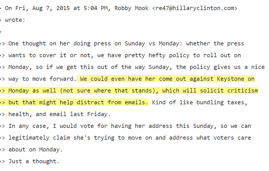 Robby Mook, Clinton’s campaign manager, suggested rolling out her opposition to the Keystone Pipeline — a project she supported as secretary of state — in the hopes that her flip-flop would “distract” from the email controversy.