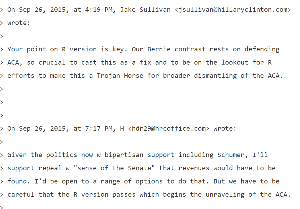Clinton staked her support for repealing the Cadillac Tax, a provision of the Affordable Care Act that President Obama has delayed, on the “politics” of the issue. Jake Sullivan, one of her top advisers, suggested ways to spin that position in order to achieve a “Bernie contrast.”
