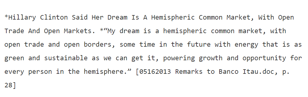 Although Clinton has during her campaign opposed major trade deals that have the potential to harm American workers, she expressed support for “open trade and open borders” during a paid speech to an Italian bank in 2013.