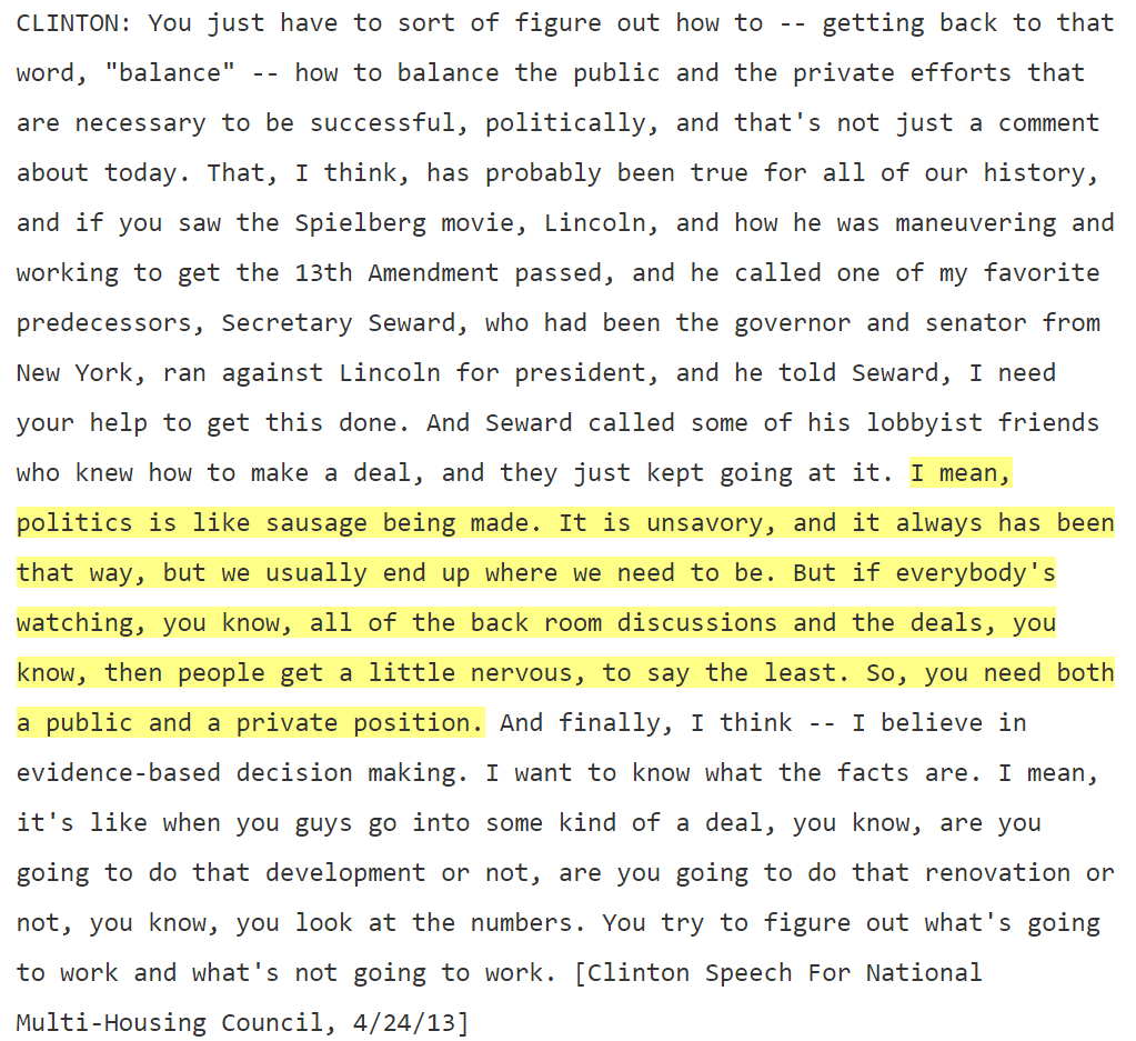When Clinton was pressed during the second presidential debate on her comment that politicians should have “both a public and a private position,” she said she had been describing the plot of a Steven Spielberg movie.