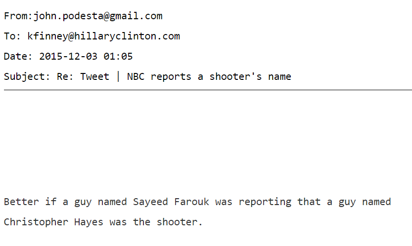Just one day after Syed Farook and his wife Tashfeen Malik claimed 14 lives in the San Bernardino terror attack, Podesta joked that he wished Farook’s name was “Christopher Hayes,” likely referring to the MSNBC anchor.