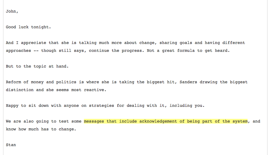 In February, a Democratic pollster said Clinton was “taking the biggest hit” from Sanders’ criticisms of money in politics. The pollster, Stan Greenberg, said he planned to test campaign messages that included an admission by Clinton that she was “part of the system” against which Sanders was railing.