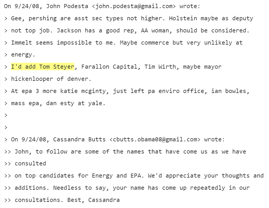 Podesta suggested naming Tom Steyer, a billionaire environmental activist and Democratic donor, to a top post at the EPA or Department of Energy early in the Obama administration.