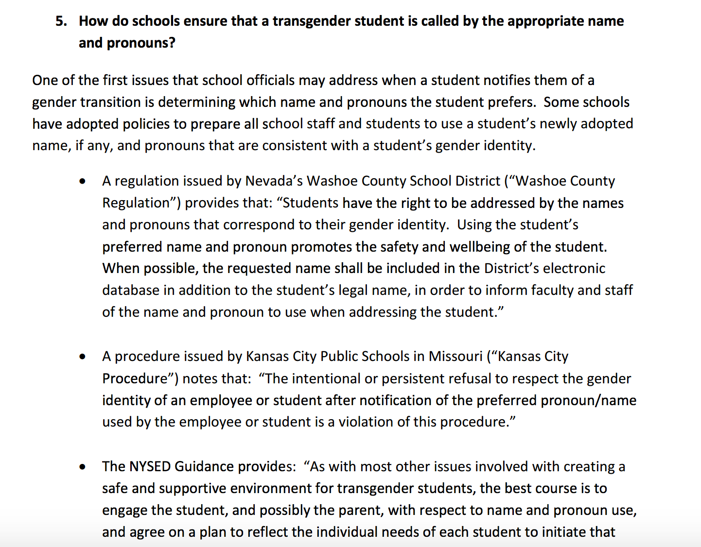 “One of the first issues that school officials may address when a student notifies them of a general transition is determining which name and pronouns the student prefers,” the document stated. “Some schools have adopted policies to prepare all school staff and students to use a student’s newly adopted name, if any, and pronouns that are consistent with a student’s gender identity.”