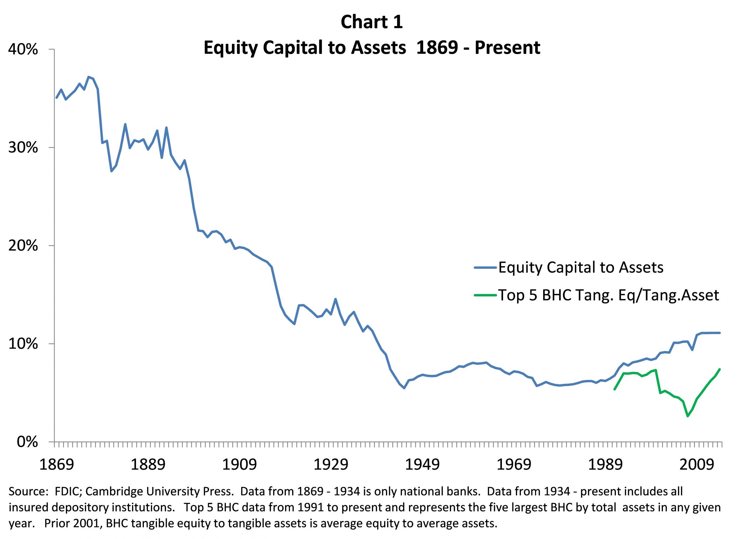 He also argued that banks become less capitalized over time as investors grow more confident that the government would bail them out if they faced failure. “As the role of government has increased, the role of equity capital has declined,” he said in the remarks prepared for the address, tracing the decline in capital ratios to the introduction of deposit insurance in 1933, the creation of the Federal Reserve in 1913, and the establishment of the Office of the Comptroller of the Currency in 1863. He produced a chart showing capital ratios declining significantly over the course of those past 150 years.