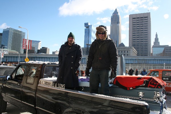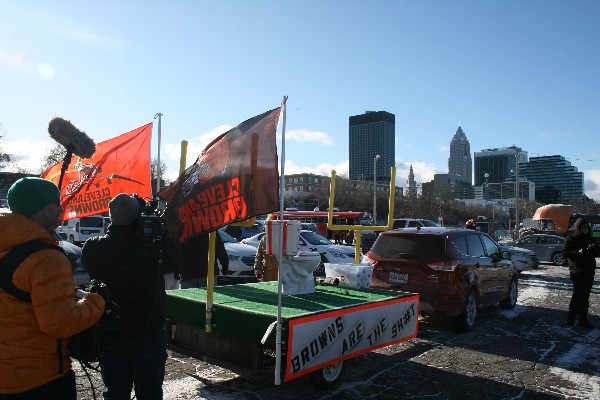 Perhaps the darkest humor on display was a coffin with a Browns flag draped over it, strapped to the back of a pick-up owned by employees of W.E. Martens & Sons funeral home on Cleveland’s west side.