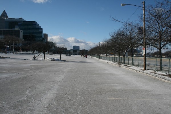 The parade line-up area between the stadium and the Shoreway was considerably warmer, insulated, somewhat, from the wind. The Cleveland Police Mounted Division’s horses drew the short straw and had to come supervise the revelry. Fans here mostly had hard liquor, which in addition to being much easier to conceal than suitcases of beer (which were also present), does not freeze. There were no major incidents or arrests.