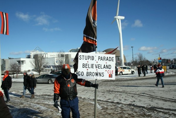 Cleveland fans debated the merits of this parade in the papers, on social media, and on talk radio all last week. Not everyone thinks it’s fun to laugh about going 0-16 and the parade even inspires a protester in a Dawg Pound mask bearing a sign that says “Stupid Parade. Believeland. Go Browns.”