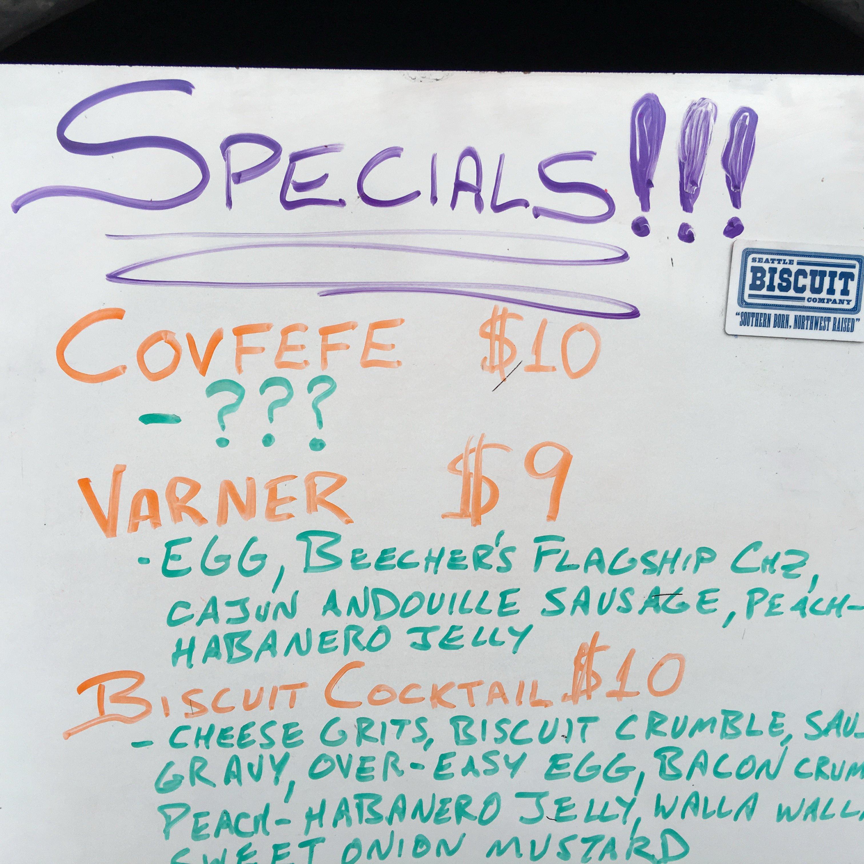 The Seattle Biscuit Company included a photo of its specials board with its application to the Patent and Trademark Office, which includes the $10 “Covfefe” sandwich.